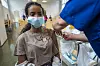 Ugbad Mohammed Shafi (16) er elev i 2. klasse helsefag på Holtet videregående skole og får første dose med vaksine. Det er vaksinesenteret i bydel Nordstrand som har kommet for å massevaksinere elevene.Foto: Heiko Junge / NTB