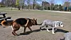 Bearded collien Lea (til h.) besøker hundejordet i Frognerparken for første gang under koronapandemien. Hun er litt skeptisk til at schäferhannen Jojo vil undersøke hvem hun er.Foto: Arnsten Linstad