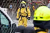 En person blir eskortert ut i oransje drakt etter at det gikk hull i en tank med potensielt giftig innhold på Sjursøya i Oslo. Foto: Tore Meek / NTB scanpix