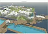 Slik kan Sukkerbiten bli. Det flytende bassenget i forgrunnen. Park, scene robåtutleie og mere til kan det bli plass til. Illustrasjon: Zeuthen & Stjern