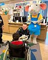 En spent pasient tar imot fra Halvors store påskeegg mens Rikshospitalet-maskoten Rasmus smiler i bakgrunnen.Foto: Oslo politidistrikt