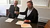 Andreas Hisdal, administrerende direktør i Intility (t.v) og daglig leder i Vålerenga Fotball Elite, Erik Espeseth, gleder seg over samarbeidet. Foto: Vålerenga fotball