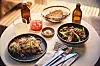 Salaten min har både varme og kalde elementer, men det beste er den grillede halloumien på toppen som er rullet i aubergine. Den serveres med brød med vegansk aioli, som er toppet med skikkelig spicy chili.