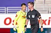 Dommer Kristoffer Hagenes kom i fokus under eliteseriekampen mellom Vålerenga og Sandefjord i Oslo. Her med Sandefjords keeper Jacob Storevik (t.v.) Foto: Terje Pedersen / NTB