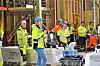 Prosjektleder Pia Sylvie Berg i Undervisningsbygg, i spissen for bygningsarbeiderne, feirer at taket på Hasle skole er tett. Foto: B. Nylund