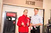 Butikksjef Martin Sande Stensrud hos Meny Ringnes Park og Ane Sunde i Oslo Røde Kors gleder seg over en ny pantemillionær i Pantelotteriet. Foto: Katrine Lunke
