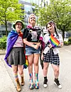 27-åringene Stine Lind Hjemly (t.v.), Ellen Wright og Nano Fladmark hadde pyntet seg i alle regnbuens farger.Foto: Ingri Valen Egeland