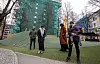 Flere beboere har samlet seg utenfor blokka. De forteller om en hverdag som, på grunn av byggestøy, ikke går overens med smitteverntiltakene i byen.