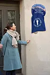 Kommunikasjonsdirektør Therese Rød Holm, fra Norsk Hydro, avduker det blå skiltet.Foto: Ingeborg Hegtun / Oslo byes vel