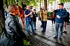 Det var rundt 300 ampre demonstranter ved valgboden ved Universitetsplassen på Karl Johan. De ropte «Ingen rasister i våre gater». Politiet sperret av området med bånd, kjøretøy og personell.
