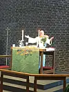 Vikarprest Helge Skraastad, som selv bor på Stovner, snakker om flokker som telles og om gjetere som passer på flokken sin. Hvor er nummer 100 synger han vakkert til menigheten før han forteller at Jesus er den gode gjeter, og at Jesus også er porten. Videre forteller han om en tur han en gang var på. Der hadde han møtt en gjeter som var slik en god gjeter. En som kjente hele flokken sin. Visste om hva de likte og ikke likte. Kjente dem alle ved navn og viste dem stor omsorg.