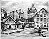 Hammersborg torg med Trefoldighetskirken i bakgrunnen. Radering: Kristian Kalmer