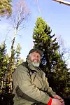 Skogoppsynsmann Håvard Pedersen har pekt ut julegrana som skal til London. Treet er 60 år gammelt, 22 meter høy og sto nær Årvollsåsen. Foto: Bjørn Sigurdsøn / SCANPIX