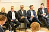Byrådet i Oslo samarbeider med NHO og LO om arbeid og arbeidsrettigheter. Byråd Inga Marte Torkildsen, byrådsleder Raymond Johansen, sjef i Byggenæringens Landsforening, Jon Sandnes, byråd Robert Steen og LO-leder Hans Kristian Gabrielsen. Foto: Bernt Sønvisen / AP