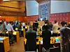 Samtlige av Oslos 59 bystyrerepresentanter markerte solidaritet med Ukraina og holdt ett minutts stillhet ved møtestart onsdag ettermiddag..Foto: Arnsten Linstad