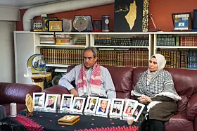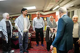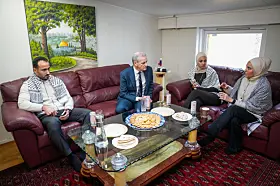 Familien Alzayegh fra Gaza hadde tatt på seg palestinaskjerf og stilt frem bilder av slektninger som har blitt drept i Gaza-krigen for å fortelle om sine opplevelser til statsministeren.