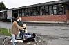Håkon Lorentzen (på sykkel) med Bolteløkka-elevene Elise og Virva. Ved siden av står Magnus Buflod foran velferdsbygget ved Veterinærhøyskolen. Bolteløkka FAU mener bygget kan brukes sammen med paviljongløsningen. Foto: Arnsten Linstad