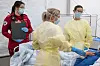 Sykepleier Marianne Løvaas (i midten) og Julie Isaksen (t.h.) har nettopp tatt i mot en koronapasient ved Diakonhjemmet sykehus i fjor.Foto: Heiko Junge / NTB