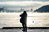 En kvinne fotograferer frostrøyken over Indre Oslofjord.