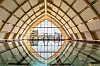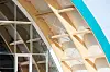 Økern bad er et sjeldent eksempel på midlertidighet kombinert med god design. Limtre har sin styrke i buer, og har gitt en særpreget form til det store, åpne hallrommet. Det er over ti meter høyt under taket.Foto: Tove Lauluten/Kultur- og idrettsbygg Oslo KF
