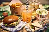 Veganske Kristin går for Vegan Christmas Wrap, Crushed Pea Salad og en Goji Berry Juicy Water. Jeg velger en Halloumi & Avocado Burger, LEON Baked Fries og en White Tea & Peach Juicy Water. Innpakningen er fargerik og fin, og sammen med skåler med frukt på disken, grønne planter her og der, får man helt klart en sunnere følelse enn man vanligvis gjør hos konkurrentene.