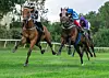 En galopphest har en toppfart på over 70 km/t, og den akselererer til toppfart i løpet av noen få galoppsprang. Her stormer Viktoria Aurora Hughes (grå/sort drakt) ut fra start. Til høyre, hesten Twilly og jockey Muriel Silva MachadoFoto: Marek Rzewuski