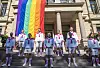 Oslo fagottkor synger mens regnbueflagget henges opp på regjeringens representasjonsbolig i Oslo i forbindelse med Oslo Pride i fjor.