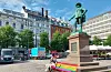 Kong Christian IV var lei av at Oslo brant ned og måtte bygges opp. Dessuten likte han dårlig at byen lå ubeskyttet under Ekeberg. "Der skal byen ligge", sa han og pekte på området bak Akersus festning, det vi i dag kaller Kvadraturen. Nå står Christian IV på sokkel på Stortorget.Foto: Anders Høilund