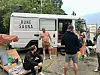 Ragna Marie Fjeld i Oslo Badstuforening holder foredrag om badstueflåter i Oslo. Bak henne står den tyske "saunabilen" Rune Sauna, oppkalt etter Rune Reite i Oslo Badstuforening.Foto: Oslo Badstuforening