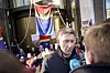 Olje- og energiminister Terje Aasland ankommer Akersgata for å snakke med aksjonister som sitter ved inngang til departementet tirsdag formiddag.Stian Lysberg Solum / NTB