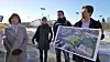 Dag Hovdhaugen i UDE, foran banen på Voldsløkka i dag, viser frem en illustrasjon av hvordan skolebygget og området kan bli i fremtiden. Fra venstre: Rigmor Hansen i Undervisningsbygg, Elisabeth Anker og Kjetil Storås i bymiljøetaten, og Hovdhaugen. Foto: Tarjei Kidd Olsen