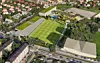 Slik kan det se ut på Voldsløkka i 2022. Skolebygget er det lange hvite øverst. Heidenreich-bygget som skal bevares er det lange gule huset knyttet til skolebygget. Foran dette og på skoletomten står det i dag et stort rødt murbygg som tilhørte nettopp Heidenreich-fabrikken. Illustrasjon: Asplan Viak AS