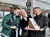 Her tar overkonduktør Stian imot Flyktninghjelpens pepperkakehus til Pepperkakebyen i Bergen